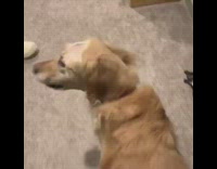My dog was declared cancer free so i'm reverse searing him a steak. Brown golden retriever dog with a scar on his head, shaved head, cancer free, walks, twirls around in circles, owner, man has steak in bowl for him.