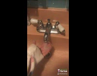 Flip the switch challenge. TikTok. Guy has cloned himself to play both the girl and guy parts of the challenge. Black shirt, blue tank top, white towel on head, sink, bathroom, chandelier. Single life.